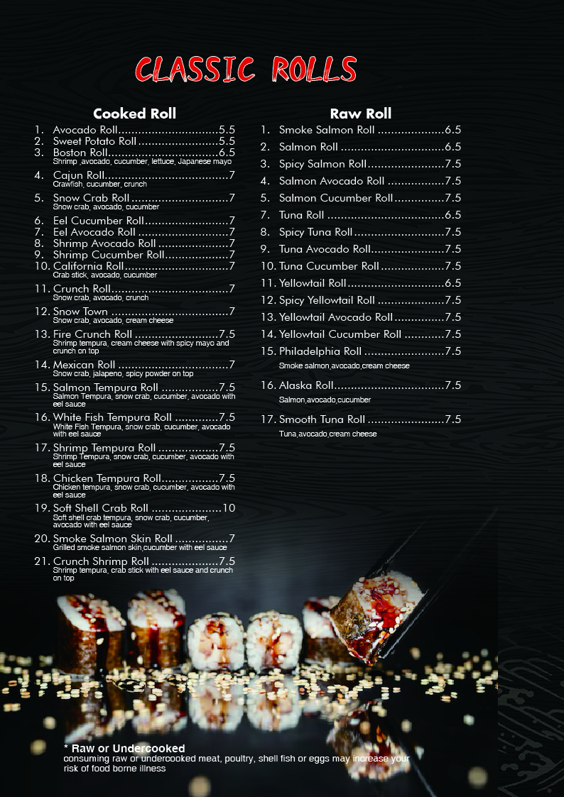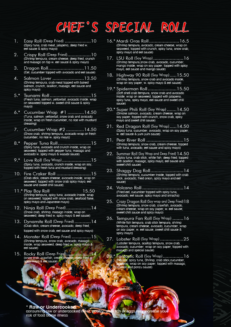 California roll, tuna roll, salmon roll. Consuming raw or undercooked meat, poultry, shellfish or eggs may increase your risk of food borne illness.