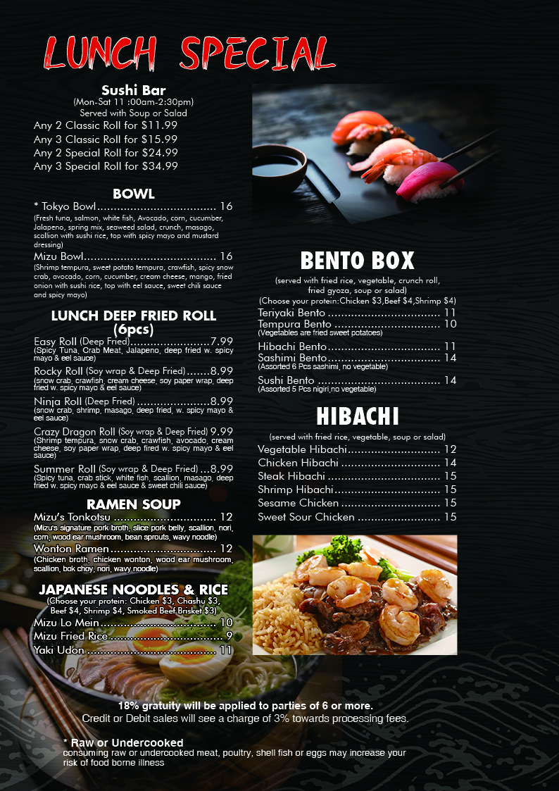 Welcome to Sushi Mizu, a hidden gem located at 722 E Admiral Doyle Dr, New Iberia, LA. This restaurant offers a delightful menu that caters to sushi lovers and those seeking a relaxing dining experience. Customers rave about the freshness of the sushi, with highlights like the Tokyo Bowl and Spiderman Roll featuring bold flavors and expertly crafted ingredients.